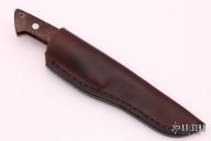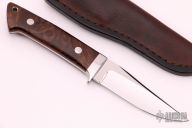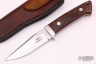 This Loveless Style knife from James Sponaugle features a mirror finished blade with a false top edge, .159" blade stock and 1.162" blade depth, full tapered tang construction. The handle has a stainless steel guard, desert ironwood burl scales with red liners, lanyard hole at the butt. Comes with brown leather sheath. Excellent condition.
