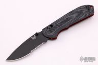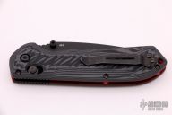 The FREEK, by Benchmade, features a drop point CPM-M4 steel partially serrated blade with a black finish, dual thumb studs and a notched thumb ramp. The handle is composed of black/grey G-10 and red G-10 liners, black tip up reversible stainless tip pocket clip. Includes original box and papers. Excellent condition.