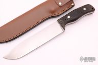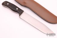 This 8" Big Boar Tusker by Scott Gossman features a satin finished clip point blade with a full tang construction, .242" Blade Stock and 1.747" Blade Depth. The handle is composed of tan/black canvas micarta scales with orange liners. Includes leather sheath with belt loop. Excellent condition.