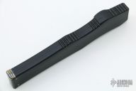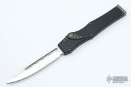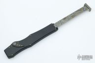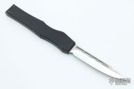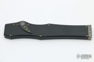 This custom Halo V OTF automatic by Marfione Custom Knives has a hand-ground mirror polished blade with satin flats and fullers. The handle is a black anodized aluminum, blasted and bronzed stainless hardware, flamed titanium charging handle, lightning strike carbon fiber face plate. Marked with the dagger logo, "A. Marfione", s/n 007 and dated 01/2015 on charging handle. Comes with original box, COA and papers. Excellent condition.