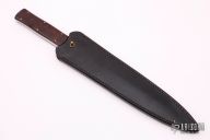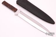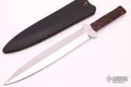This Dagger by Jeff Morgan features a mirror polished double edged blade, .355" blade stock and 1.875" blade depth, full tapered tang construction. The handle has ironwood scales with brass pins. Comes with brown leather sheath with belt stud. Excellent condition.