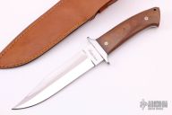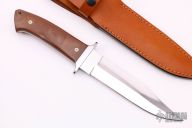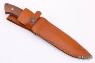 This Loveless Style Fighter by Predate Knives features a mirror polished blade with false top edge, .186" blade stock and 1.431" blade depth, full tapered tang construction. The handle has a stainless steel guard with brown linen micarta scales, black liners and mosaic pins, lanyard hole at the butt. Comes with a brown leather sheath and COA. New from maker.