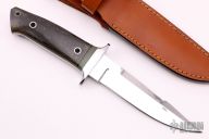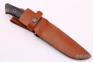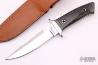 This Fighter with Loveless Style handle by Predate Knives features a mirror polished blade with false top edge, .219" blade stock and 1.213" blade depth, full tapered tang construction. The handle has a stainless steel guard with paper micarta scales, black/yellow liners and mosaic pins, lanyard hole at the butt, has a green G-10 spacer under the guard. Comes with a brown leather sheath and COA. New from maker.