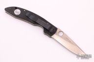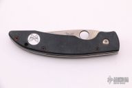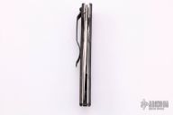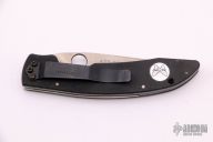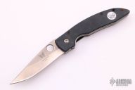 This Mini AFCK Linerlock folder by Benchmade has a satin finished blade with thumbhole, and notched thumbrest. Handle is black G-10 over titanium liners, black fiber back spacer, lanyard hole. Excellent condition.