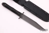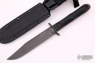 The Ek Model 5 Bowie fighter is part of the John Ek Commando lineup from Ka-Bar. It features 1095 Cro-Van high carbon steel with a black parkerized finish. The handle is outfitted with textured glass-filled nylon scale and traditional X-head fasteners. A US-made Celcon® sheath with retaining strap, self-locking function and multiple tie-down points is also included. Made in the USA. Excellent condition. Comes with original box, sheath and papers.