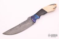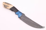 This Fighter from PJ Ernest features a Damascus blade with fileworked spine, .178" blade stock and 1.514" blade depth, full tang construction. The handle is comprised of blued mosaic Damascus bolsters and mammoth ivory scales with blackwood spacer. Has a few scratches, has some small gaps in the handle scales, otherwise good condition. Comes with a zippered case.