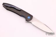 This Yamhill Linerlock Folder by Eric Ochs of Ochs Worx features a stonewash finished blade with flipper. The handle has carbon fiber scales, anodized and orange peel finished titanium liner, Timascus backspacer and tip up clip with hidden screws, blue anodized pivot. Includes zippered case and COA dated 10/18-21. Nice detent, lockup and blade seating. New from maker at the 2021 CCKS.