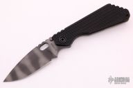 This SNG framelock folder by Mick Strider features a tiger stripe blade and a dimple pattern black aluminum and flamed titanium frame and tip up titanium clip. Includes a "Lock Bar Stabilizer" for maximum reverse lock retention. Nice detent, lockup and blade seating. New condition.