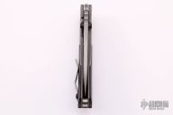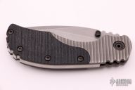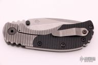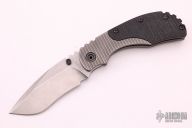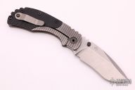 This RC by Strider Knives features a stonewashed blade with dual thumbstuds and a notched thumbrest. The handle has a milled titanium frame with black G-10 scales, titanium backspacer and tip up clip. Excellent condition.