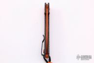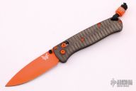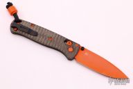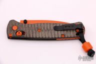 The 535 Bugout knife is built with a custom green canvas micarta handle and an orange cerakoted blade and hardware.