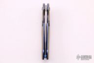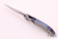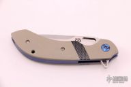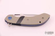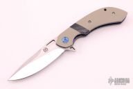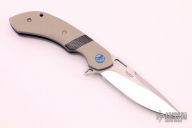 This custom Mike Vagnino designed Compact Wayfarer flipper features a hand rub satin finished blade with mirror polish bevels, notched thumbrest and hollow flipper. The handle has G10 scales with jeweled titanium liners, anodized titanium backspacer. C-Tek Inlay. Great action that requires no wrist movement. Nice detent and lockup. Comes with COA Dated 10/20/15. WC046 inside backspacer. Comes with zippered/padded case. Excellent condition.