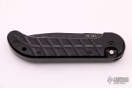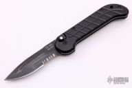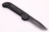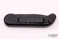 This Ox Enterprises / Charles Ochs coil-spring automatic features a black partially serrated blade and black anodized aluminum frame with tip up black stainless steel clip. Strong and fast opening. Nice function. Has scratches, good condition.