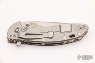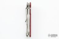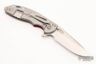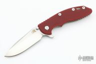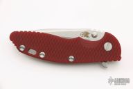 This XM-18 Flipper by Rick Hinderer Knives features a 3.5" stonewashed finished blade, notched thumbrest and flipper, dual thumbstuds. The handle has a red G-10 scale, and stonewashed titanium handle/clip. Clip can be mounted for tip up or down carry. Nice lockup, seating, and detent. Comes with original box. Excellent condition.