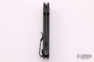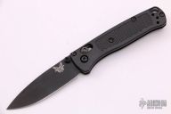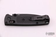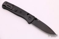 The Mini Bugout features a drop point blade with a flat dark Cerakote finish. It's a manual opener with ambidextrous thumb studs. This AXIS lock has a black frame and black hardware, a black mini deep-carry pocket clip, and a lanyard hole. Includes original box and papers. Excellent Condition.