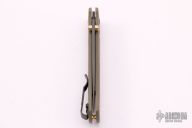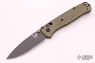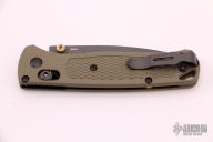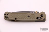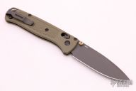 The Benchmade Bugout features a drop point blade with a grey Cerakote finish. It's a manual opener with ambidextrous thumb studs. This AXIS lock has an OD handles with brass spacers and black hardware, a black mini deep-carry pocket clip, and a lanyard hole. Includes original box and papers. Excellent Condition.
