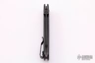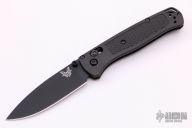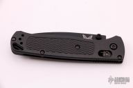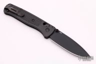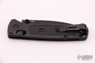 The Bugout features a drop point blade with a flat dark Cerakote finish. It's a manual opener with ambidextrous thumb studs. This AXIS lock has a milled aluminum frame and black hardware, a black mini deep-carry pocket clip, and a lanyard hole. Includes original box and papers. Excellent condition.