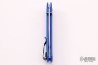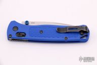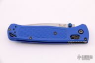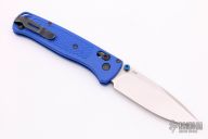 The Benchmade Custom Bugout features a drop point blade with a stonewashed finish. It's a manual opener with ambidextrous thumb studs. This AXIS lock has blue handles with black hardware, a mini deep-carry pocket clip, and a lanyard hole. Has a couple light scratches, otherwise excellent condition.