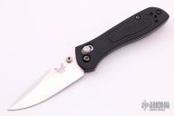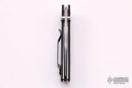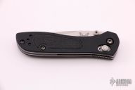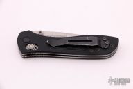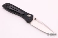 This 707 from Benchmade features a stonewashed spear point blade with dual thumbstuds and a false top edge. The handle has anodized aluminum scales and black G-10 inserts, stainless steel liners, and a black backspacer. Tip up reversible stainless steel clip. Has a few scuffs/scratches, otherwise excellent condition.