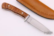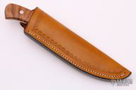 This Hunter from Larry Page features a mirror polished drop point blade, .175" blade stock and .987" blade depth, full tapered tang. The handle is comprised of a polished stainless steel guard with golden maple burl scales over red liners. Marked #5315 on the underside of the tang and on the back of the sheath. Excellent condition. Includes leather sheath with belt loop.