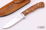 "I have been a knife maker since 1983. I got my start watching George Herron in his shop. He has always been a mentor, answering all of my questions and helping with the little problems of knifemaking. Most of my work is geared toward hunters. Since the most important part of the hunt is not the gun, no matter how much it costs, but a knife that will get the job done comfortably and quickly. I also build a few boots and fighters. All blades are ATS-34 that are professionally heat-treated to a Rockwell 59. All guards, bolsters, and pins are 303 Stainless. All knives are serial numbered. The sheaths are pouch type and are wet-formed to fit each knife."