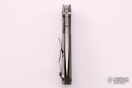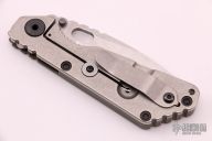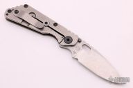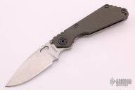This Strider SNG framelock folder features a stonewashed blade with thumbhole and notched thumbrest. The handle has a green G-10 and stonewashed and anodized titanium frame with titanium clip, tip up carry. Jimping on blade spine. Nice lockup, detent, and blade seating. Has some slight staining on the blade in the sharpening choil area, otherwise excellent condition.