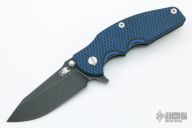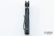 This Jurassic by Hinderer Knives features a battle black clip point blade with notched thumbrest and flipper. The handle has a stonewashed and blue anodized titanium frame with a blue G-10 scale, tip up or down reversible clip and a modular backspacer. Nice detent, lockup and blade seating. This knife has the Tri-Way pivot system. Comes with original box. Excellent condition.
