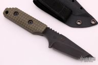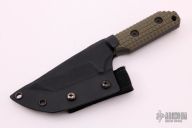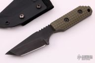 This knife by Strider Knives features a black coated tanto style blade with notched thumbrest, .248" blade stock and 1.306" blade depth, full tang construction. The handle is comprised of GREEN G-10 scales with MEFP. Lanyard hole in pommel. Includes kydex sheath. Has some scuffs and scratches, otherwise good condition.