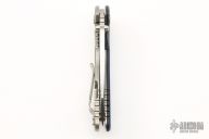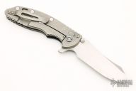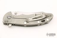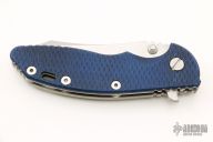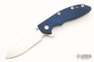 This XM-18 Skinner from Rick Hinderer Knives features a 3.5" blade, notched thumbrest and flipper, dual thumbstuds. The handle has a black/blue G-10 scale, and stonewashed titanium handle, tip up or down pocket clip, fuller tab and standoffs. Clip can be mounted for tip up or down carry. Nice lockup, seating, and detent. The blade has been refinished and satin finished, has scuffs and scratches, would make good user condition.