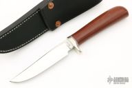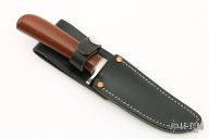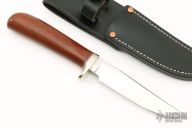 This Hunter by David Messer has a mirror polished blade with hidden tang construction, .190" blade stock and .949" depth. Handle has a nickel silver guard with a brown canvas micarta grip and red/white/blue spacers. Excellent condition. Comes with a black leather sheath with belt loop.