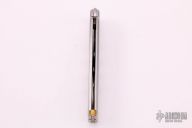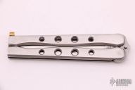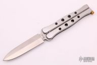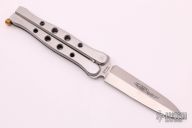 This Balisong by Parker Cutlery Company features a satin finished double edged blade. The handles are stainless steel with a brass t-latch. Has some scratches, otherwise good condition.