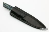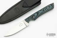 This knife by Don Llewellyn features a satin finished blade with .139" blade thickness and 1.005" blade depth, full tang construction. The handle has black/green G-10 scales. Comes with a black leather sheath with belt loop. Excellent condition.