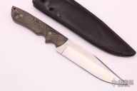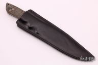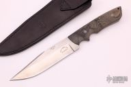 This knife by Don Llewellyn features a satin finished blade with false top edge, .169" blade thickness and 1.469" blade depth, full tang construction. The handle has black/green linen micarta scales. Comes with a black leather sheath with belt loop. Excellent condition.