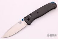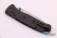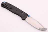 The 535-3 Bugout knife is built with a carbon fiber handle and a satin finished blade with a plain cutting edge.