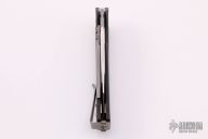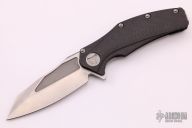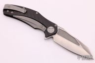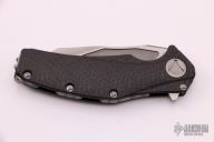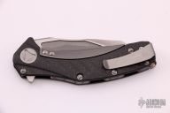This Mini Matrix by Marfione Custom Knives features a Tri-tone stonewash finished blade with notched thumbrest and flipper. The handle has a carbon fiber and bead blasted titanium frame with matching tip up clip, flamed titanium backspacer. Blasted hardware. Comes with a zippered case and original box. Excellent condition. Dated10/2013.