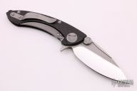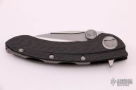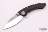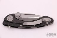 This Marfione Whaleshark framelock flipper features a hand ground hand rubbed high polish finished blade with dual thumbstuds, notched thumbrest and flipper. The handle has a sculpted carbon fiber frame. Titanium fittings. Dagger logo on clip. No serial number. Comes with original box and zipper case. Excellent condition.