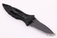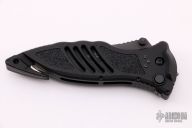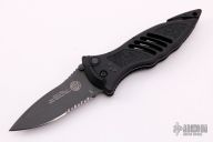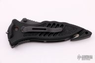 This CQD Mark 1 Auto from Masters of Defense has a spear point black partially serrated blade with dual thumb studs. Handle is black aluminum with non-slip inserts, reversible black tip down clip, seat belt cutter, lanyard hole and glass breaker. Excellent condition.