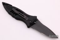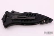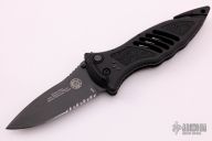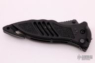 This CQD Mark 1 Auto from Masters of Defense has a spear point black partially serrated blade with dual thumb studs. Handle is black aluminum with non-slip inserts, reversible black tip down clip, seat belt cutter, lanyard hole and glass breaker. Excellent condition.