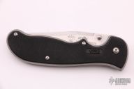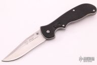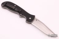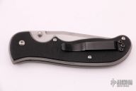 This Pat Crawford designed Carnivore from R.E.K.A.T features a stonewashed clip point blade with slight recurve. The handle is comprised of black G-10 over bead blasted aluminum liners with steel right hand carry, tip up pocket clip and steel barrel spacers. Excellent condition. Comes with original box.