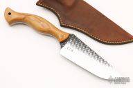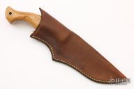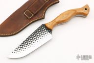 This Straight Back Hunter by CLB Creations features a satin finished blade made from a farrier's rasp, .228" blade stock and 1.652" blade depth, full tang construction. The handle has cherry wood scales with nickel silver pins. Comes with a brown leather sheath. New from maker.