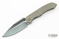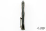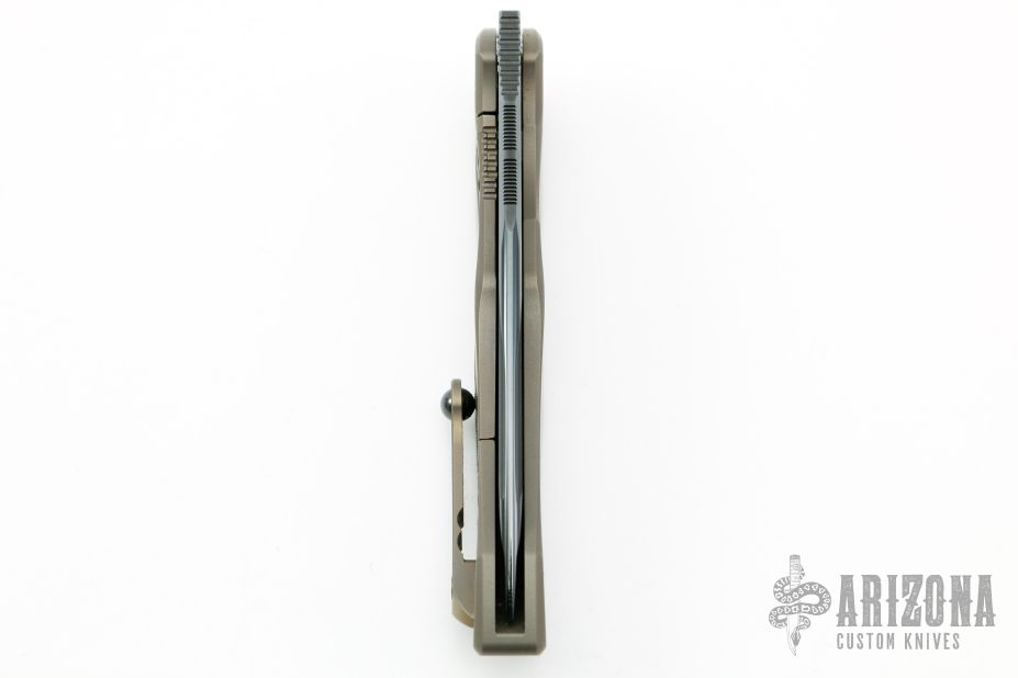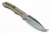 This Anax by Marfione Custom Knives features a blued W2 blade with notched thumbrest and hamon. The handle has an integral bronzed titanium frame. Tip up titanium clip with silicon nitride ball bearing. Nice detent, lockup and blade seating. Comes with original box, COA and zippered case. Dated 10/2014 and S/N 15. Excellent condition.
