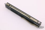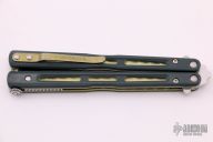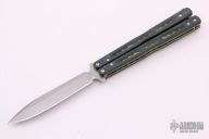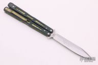 This Model 51 Morpho Balisong from Benchmade has a satin finished S30V spear point blade with swedge. Handle is green G10 with green jeweled/ anodized titanium liners and matching titanium tip up clip. Marked "Limited Edition 144 of 200" on B side of blade. Comes with Benchmade draw string pouch. Excellent condition.
