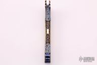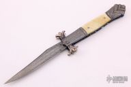 This ambidextrous bolster release auto by Richard Wright features a Rados Turkish Twist Damascus clip point blade with false top edge. The handle has matching Damascus bolsters that have been beautifully sculpted , carved and fluted, gold lip pearl scales, fileworked screws, fileworked and anodized titanium liners, carved fileworked and engraved anodized titanium backspacer with filework and engraving inside and a gold lip pearl inlay, mammoth ivory blade stop in the handle. Nice lockup, action and blade seating. This piece is stunning. Excellent condition. Dated 11/2004 inside the liner, and #98 on the ricasso. Comes with a zippered case.