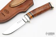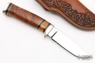 This knife by Randy Lee features a mirror polished blade with .181" blade stock and .922" blade depth, hidden tang construction. The handle has a nickel silver guard and butt, buckeye burl grip, and a spacer pattern consisting of red/nickel silver/black linen micarta/amber. Comes with a hand tooled brown leather sheath. Excellent condition.