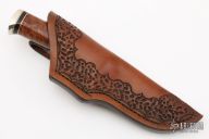 Randy’s fascination with knives began as a young man when he made his first knife in a high school “metals” class. He collected them for years and eventually began making his own to get a better edge-holding skinner for hunting. Randy read books and visited local makers to learn the craft. In 1979, he decided to invest in shop equipment so that he could properly master his knife making skills. In a few years, he was making and selling knives to local hunters, while continually developing his style and craftsmanship. He attended his first knife show in 1986 and has been participating in about six shows each year since then. As an avid hunter, Randy knows how a good hunting knife should perform. He loves to “field-test” his designs and feels that a quality knife should not only look great, but perform well as a tool. He offers a wide variety of knife styles; from utility hunters and fighters to collector pieces such as daggers and bowies. Although the actual work of grinding and buffing knives is very tedious, he always finds it rewarding to see the final finished product. Randy particularly enjoys meeting people who find knives as interesting and exciting as he does. Randy’s wife, Sonja Lee, is one of the premier sheath makers in the business. Using exotic hides, or leather and various forms of tooling, she has mastered the craft of sheath making. Sonja creates the custom sheaths which are provided for each of Randy Lee’s knives and she is now making custom sheaths for many other knife makers and collectors.