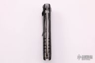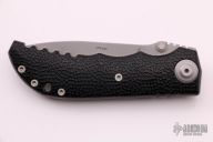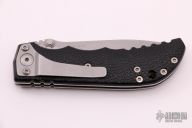 This D2 Harsey Linerlock D/A has a bead blasted, flat ground CPM-S30V spear point blade with partially serrated edge, dual thumb studs and notched thumbrest. Handle is non-slip polymer over stainless steel liners, lanyard hole, and bead blasted stainless steel tip down clip. Excellent condition. Very comfortable knife in the hand. Hard to find piece. It has a hidden button under the scale. Comes with original box and papers.