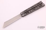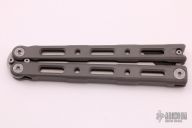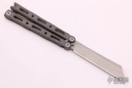 This Model 87 Balisong by Benchmade features a tumble finished wharncliffe style blade. The handle is comprised of an integrally constructed, skeletonized titanium frame with bead blast finish. Spring-loaded T latch on pommel. Comes with original box, sheath and papers. Has a few light scuffs, otherwise excellent condition.