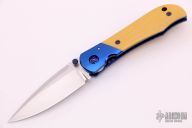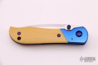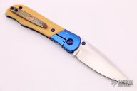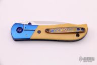This GMC by Sal Manaro features a Super Gold 2 hand rub satin finished blade with notched thumbrest and a single thumbstud. The handle has an anodized titanium frame with vintage linen micarta scales, custom milled anodized titanium screws and pivot, tip up mokuti pocket clip and a checkered and anodized titanium backspacer, lanyard hole in the butt. Excellent condition. Comes with a velcro case.