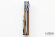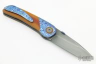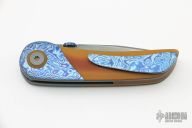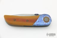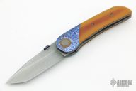 This P1 Linerlock by Edward R. Knives features an acid rubbed tanto blade with a timascus thumbdisc. The handle has timascus bolsters, vintage butterscotch paper micarta pivot collars, scales and backspacer, tip up timascus clip with hidden screws. Rides on bearings, nice detent, lockup and blade seating. Comes with zippered case and COA dated "NYCKS 2021". New from maker at the 2021 NYCKS.