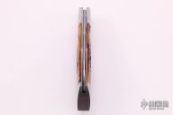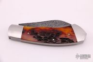This Dino by Jeff Hawkins features a Feather Damascus blade with nail nick and false top edge. The handle has stainless steel bolsters with integral liners, jigged bone covers, stainless steel escutcheon and spring. Has half-stop, flush in all positions. Comes with a zippered case. New from maker at the 2021 NYCKS.