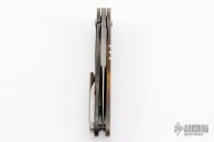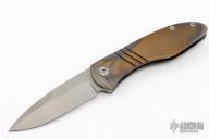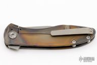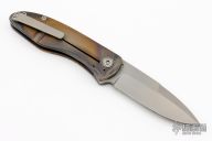 This framelock flipper Michael Vagnino. It features a tumble finished blade with false top edge and flipper. The handle has an anodized titanium frame with a bead blasted titanium tip up clip. Titanium barrel spacers. Nice detent, blade seating and lockup. Comes with a nylon zippered case. Excellent condition.